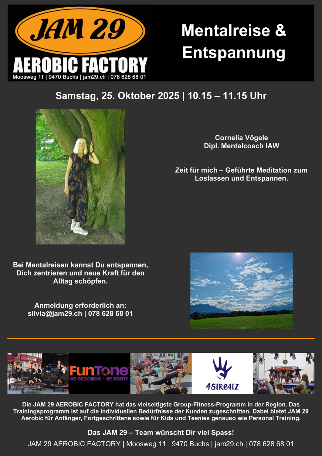 Sa 25.10.2025 | Mentalreise & Entspannung10.15 Uhr - 11.15 Uhr Zeit für mich – Geführte Meditation zum Loslassen und Entspannen. Cornelia Vögele lädt zur Mentalreise ein. Flyer JAM 29 - Mentalreise & Entspannung |